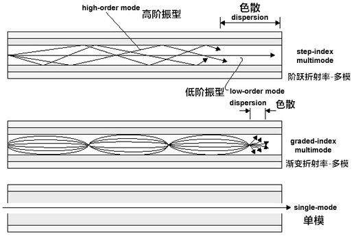 五、模态色散 LED光源有时用于多模光纤,去创造不同的速度传播的一系列波长。这将导致多模态色散,它限制了多模光纤跳线的有效传输距离。与之相反,用于驱动单模光纤的激光器产生一个单一波长的光。因此,它的模态色散远小于多模光纤。由于模态色散,多模光纤比单模光纤具有更高的脉冲扩展速率,限制了多模光纤的信息传输容量。