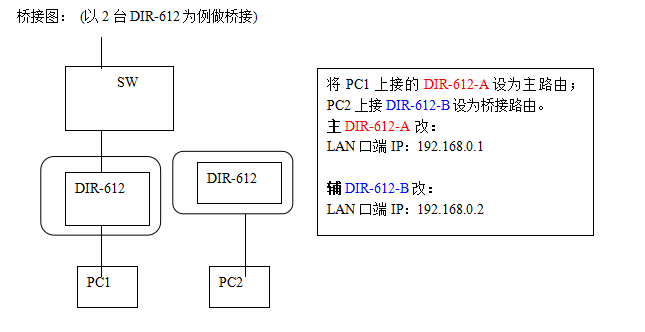 桥接图: (以2台DIR-612为例做桥接) 实验步骤: 1、登录进入主的DIR-612-A(默认密码为空),电脑让它自己获取IP,如图: 2、设置主的DIR-612-A的无线参数,如图: 3、设置DIR-612-A的无线中继,...
